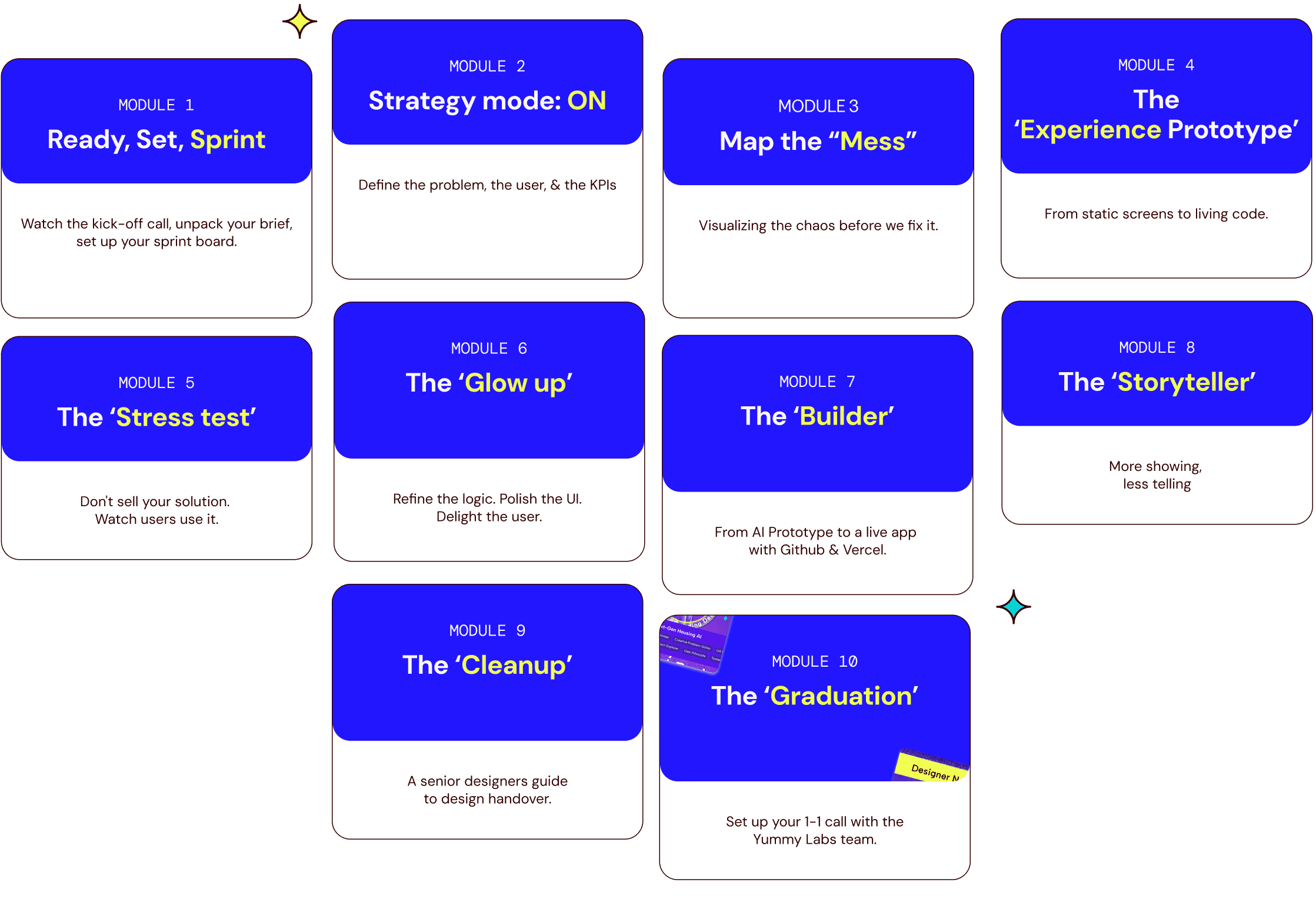 You want the full experience. If you want to be inside a real product team simulation with actual deadlines, daily direction from the Yummy Labs team, a mid-sprint review, and a final end-of-sprint review. If you want to work alongside other designers, get to meet and network with the founders in a dedicated fireside chat, and get hands-on help with AI workflows throughout. Designers who complete it receive a live sprint badge and our stamp of approval on their final case study.